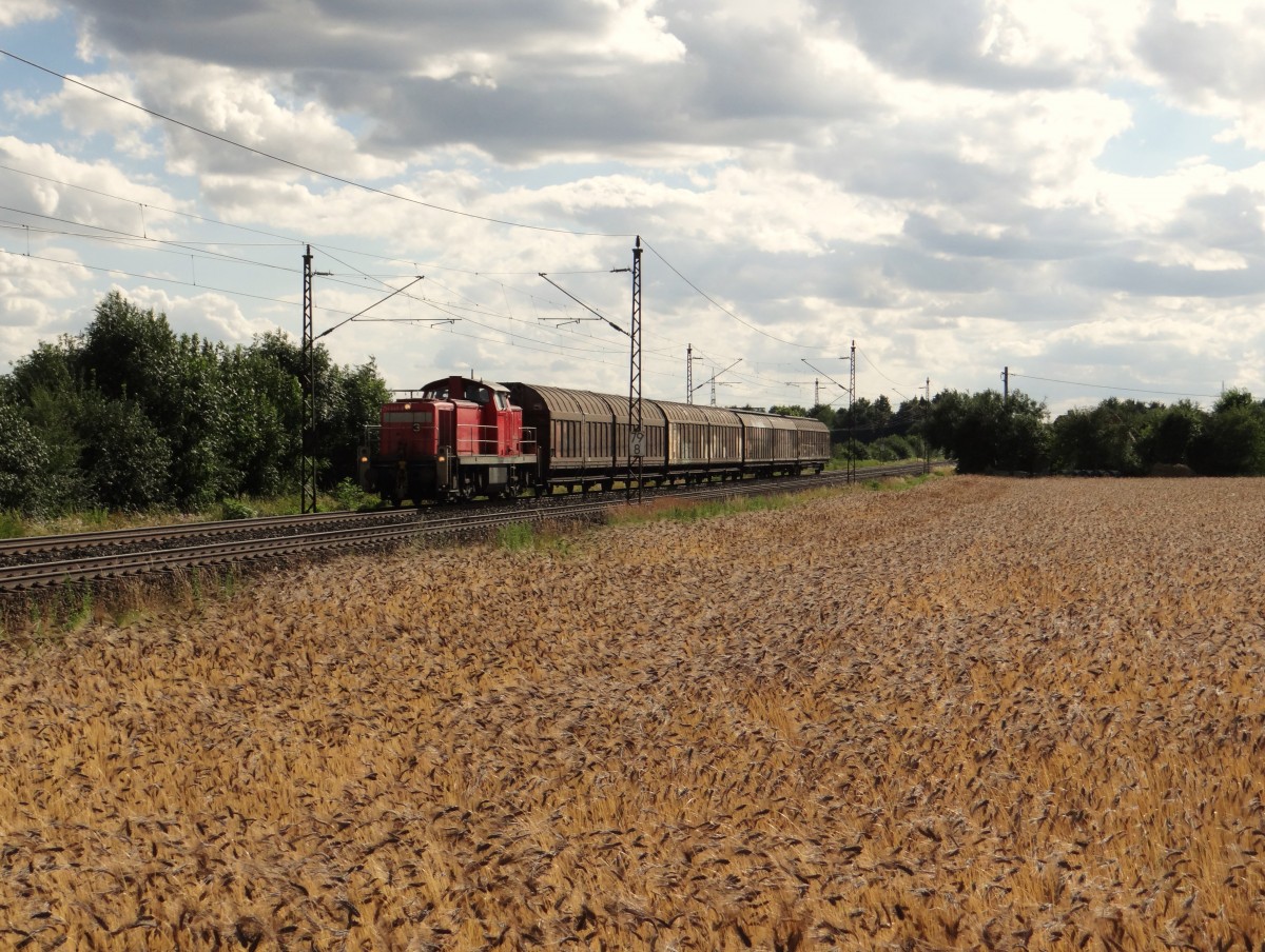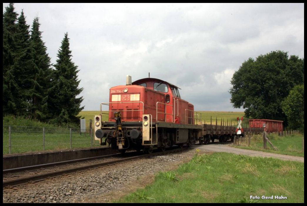 An manchen Tagen herrscht reger Verkehr auf der kurzen Werkbahn zwischen Hasbergen und dem Stahlwerk Georgsmarienhütte. Am 15.7.2015 waren mittags gleich zwei Güterzüge in Richtung Hütte unterwegs. Hier fährt 294714 der DB um 12.36 Uhr mit einem Kurzgüterzug durch den ehemaligen Haltepunkt Augustaschacht.