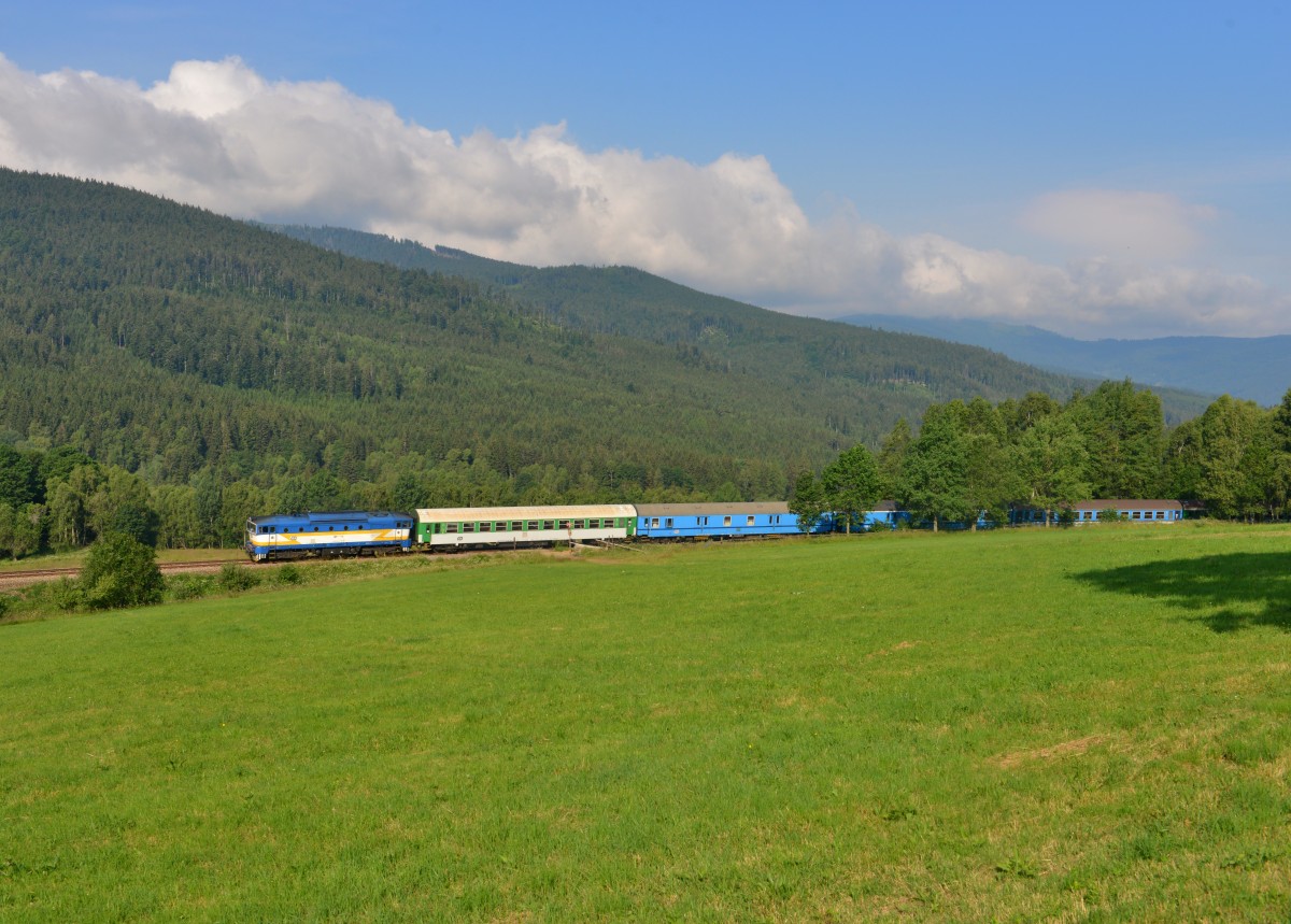 754 057 mit Os 7504 am 06.07.2015 bei Hojsova Stráž-Brčálník.