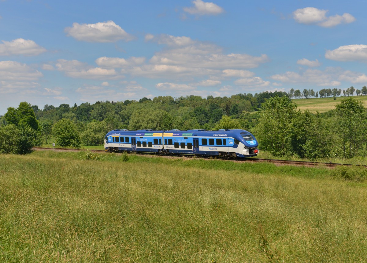 Die 754 045 mit einem Os nach Nové Údolí am 18.07.2015 unterwegs bei Volary.