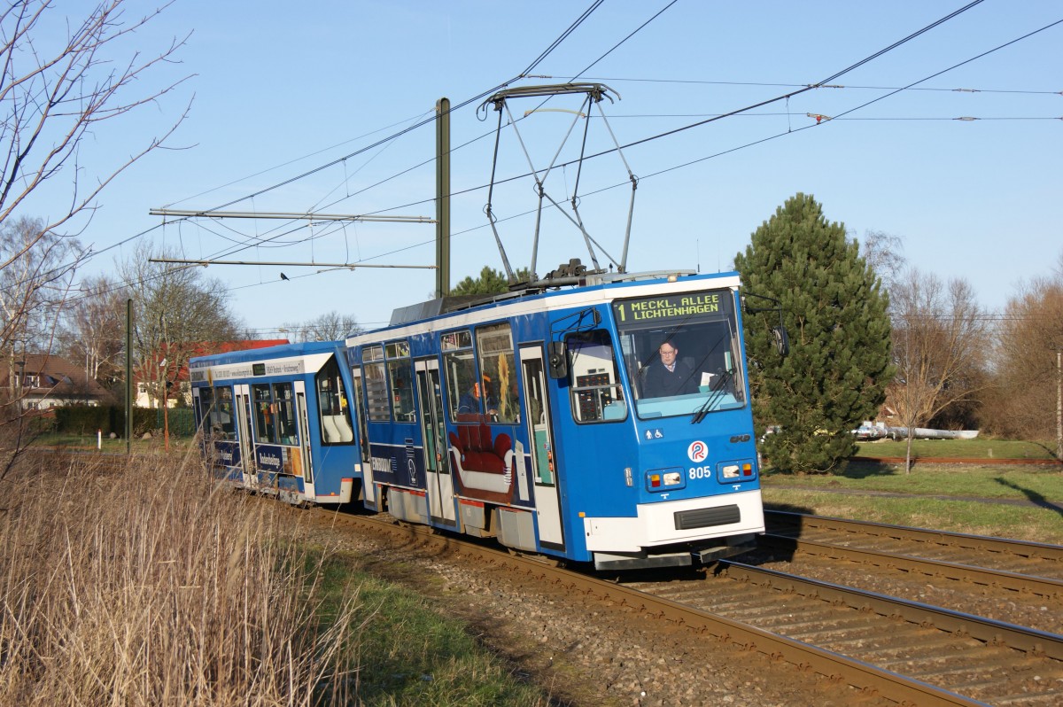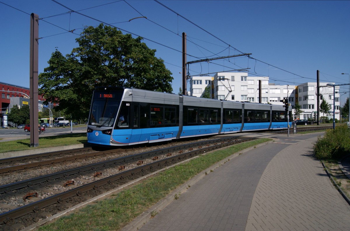 Am 08.08.2014 waren die 6N2 noch keine zwei Wochen im Planeinsatz, als Nr. 603 auf Linie 1 vor Lütten Klein Zentrum durch die Kurve fährt.