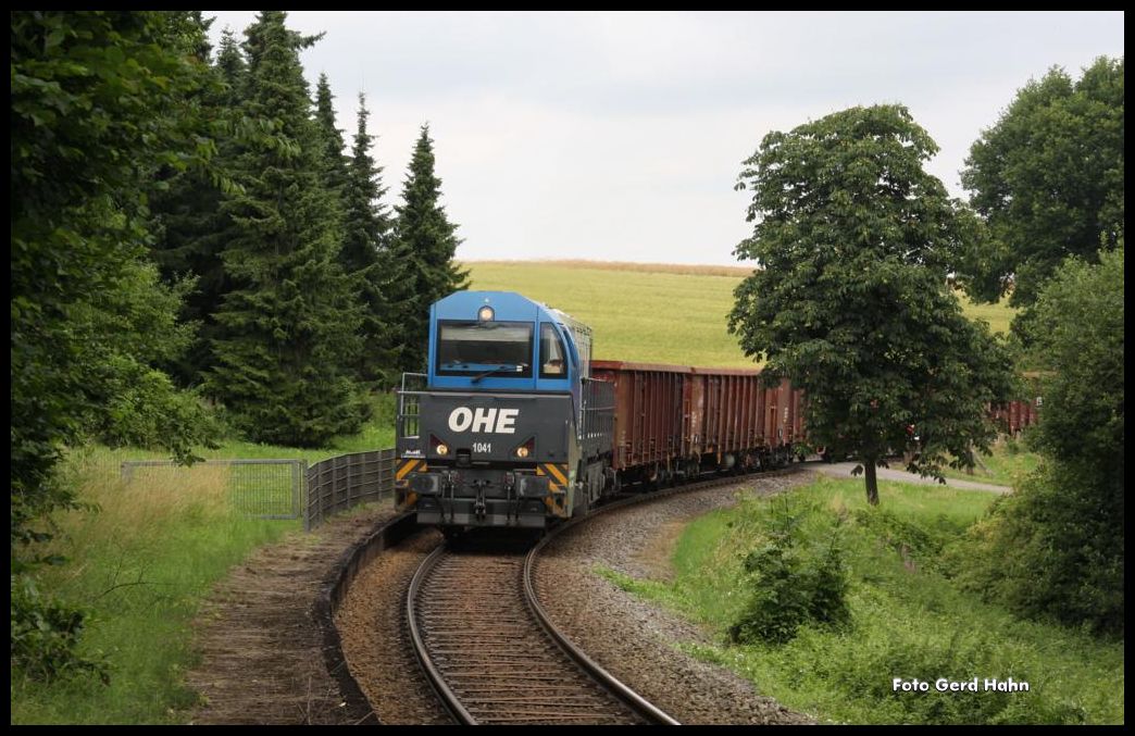 An manchen Tagen herrscht reger Verkehr auf der kurzen Werkbahn zwischen Hasbergen und dem Stahlwerk Georgsmarienhütte. Am 15.7.2015 waren mittags gleich zwei Güterzüge in Richtung Hütte unterwegs. Hier fährt OHE 1041 mit einem schweren Schrottzug um 12.21 Uhr durch den ehemaligen Haltepunkt Augustaschacht.