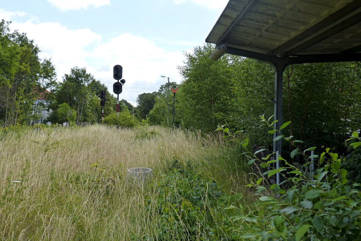 Blick von der Bahnsteigkante von Bleicherode-Stadt Richtung Bahnhof Bleicherode Ost. Seit 15 Jahren kein Bahnverkehr mehr. 15.07.2015