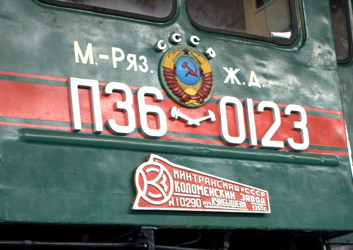 das Typenschild  der P 36 0123 , einer Breitspurschnellzuglok, gebaut 1955 in der Lokomotivfabrik Kuibischew (UdSSR).Die Lok ist so alt wie der Fotograf.Abgelichtet am 08.07.2015 in Prora.