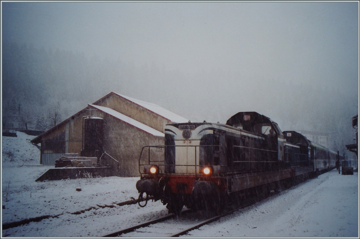 Der Schnellzug 5753 von Morez nach Paris beim kurzen Halt in Morbier mit den beiden BB 66 594 und BB 66 497. Fotografierten Bild 6. Januar 2001