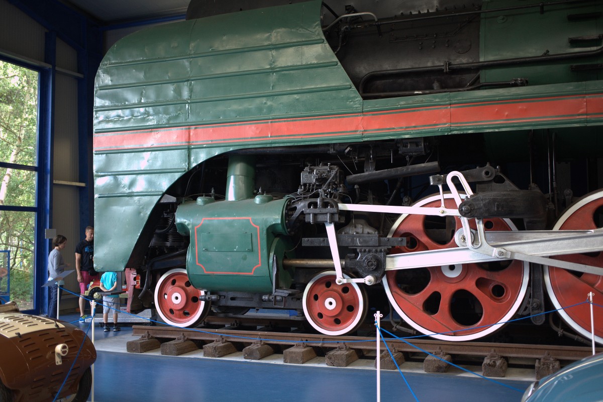 Die mächtigen Treiräder der P 36 0123 , der hellblaue Käfer erscheint dagegen winzig, beides "Wirtschaftswunderfahrzeuge ?" Eisenbahn - und Technik Museum Prora.