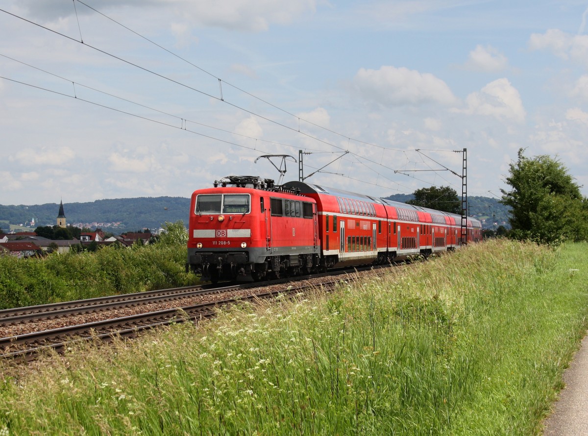 Die 111 208 mit einem RE nach Nürnberg am 21.06.2011 unterwegs bei Pölling.