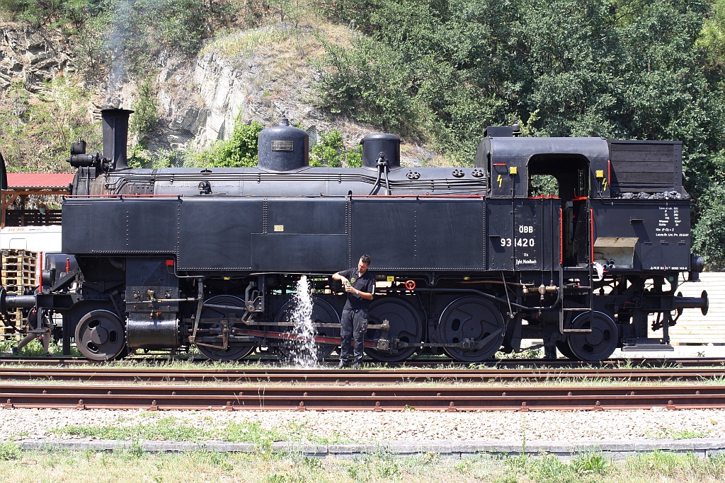 Erholunsgphase für Lok und Mannschaft; NLB 93.1420 am 19.Juli 2015 während der Wendepause vom P 16960 auf P 16961 im Bf. Spitz a.d. Donau.