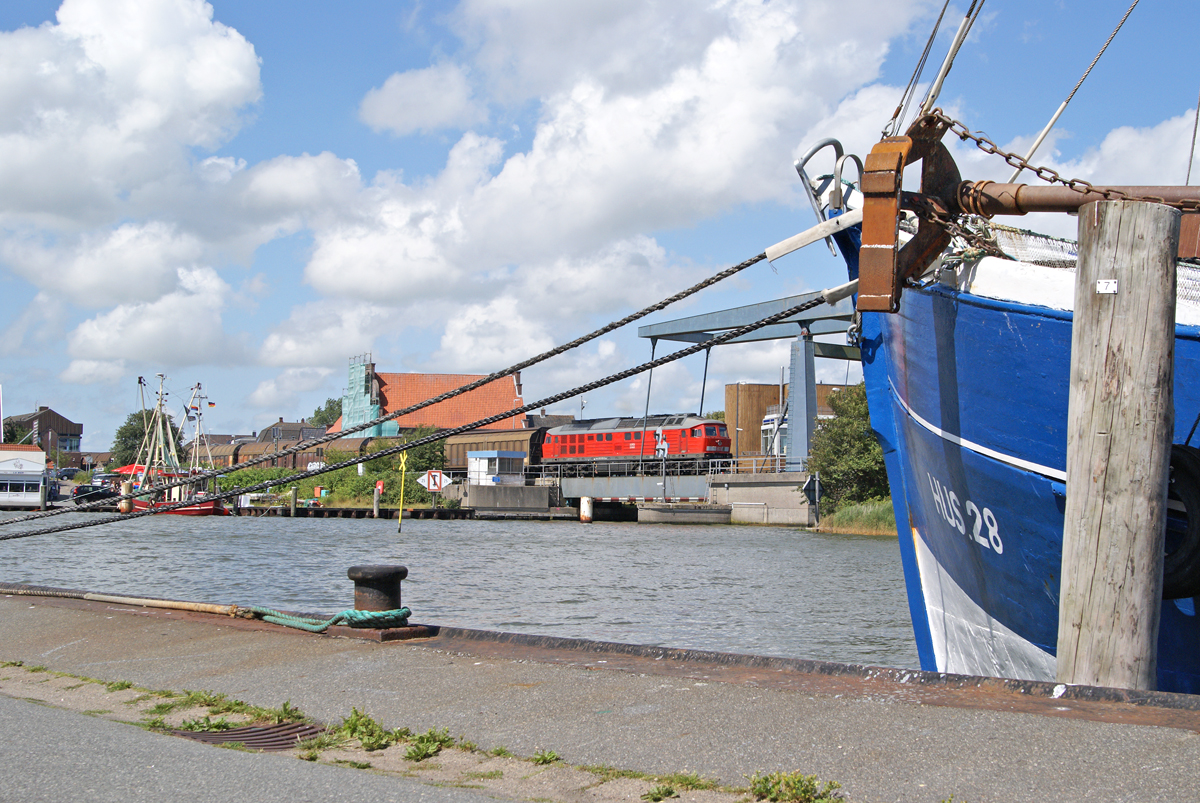 Mit 47409 (Esbjerg-Maschen) überquert 232 635 am 18.07.2015 die Klappbrücke der Marschbahn im Husumer Hafen.
