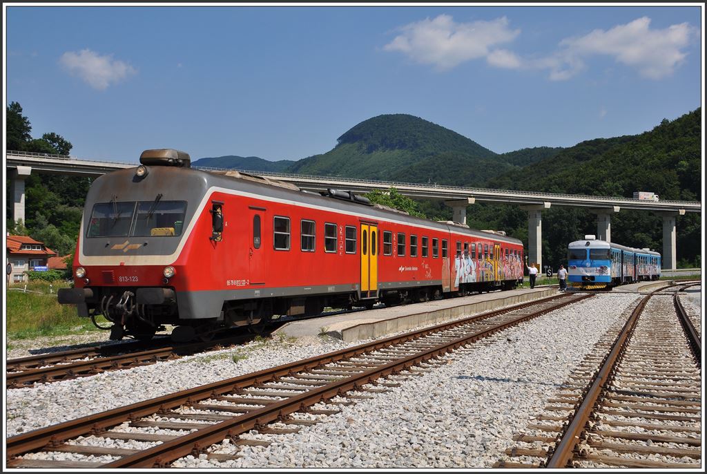 Wie auch immer der Strategieplan aussieht, es treffen sich nur zweimal am Tag Züge in Durmanec und zwar um 15.00 und um 17.00 Uhr. Aus diesem Grund ist das Zug- und Zollpersonal zahlreicher als die der Mitreisenden. Reg7811 mit 814 123/813-123 ist aus Celje eingetroffen. Der Kroatische TW 7 121 012 wird als Reg 3127 nach Zabok zurückkehren. (01.07.2015)