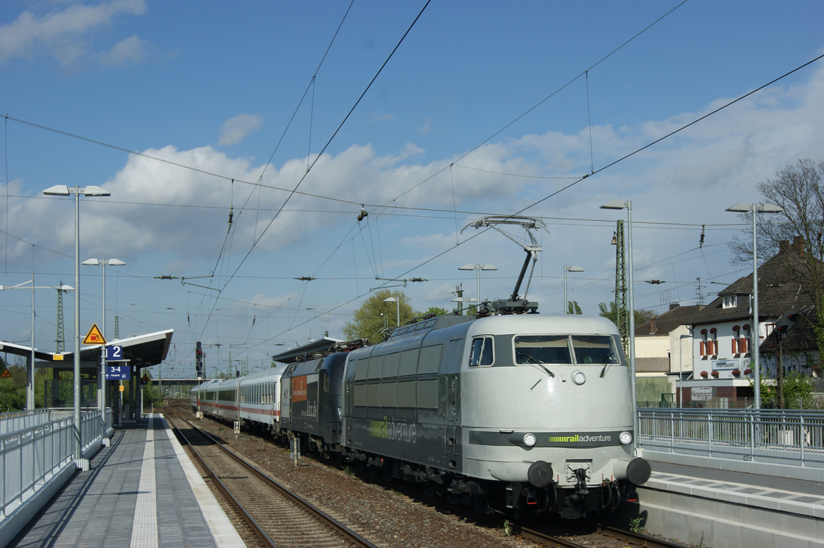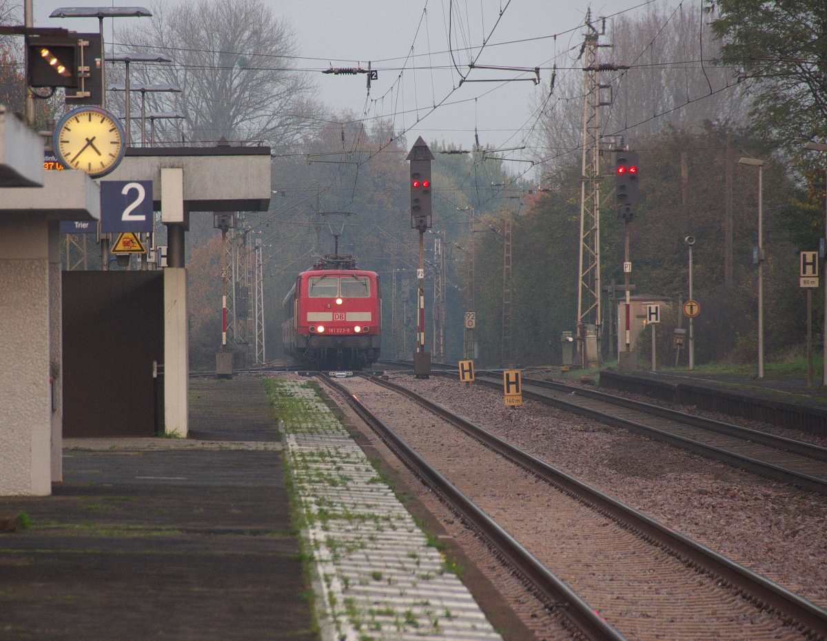 Es war ein Lotteriespiel mit dem Wetter am 02.11.2014. Im Saarland klarte der Nebel auf und wir entschlossen uns spontan zur 181er Reise an die Moselstrecke. Im Hochwald herrschte Nebel und es dunkelte sich ein, doch im Moseltal und am Rand der Südeifel klarte es wieder auf. Nach dem IC 133 in Schweich machten wir uns auf den Gegenzug IC 134 Norddeich Mole - Luxembourg abzulichten. Wir fuhren dem Zug etwas entgegen damit wir das Restlicht nutzen konnten. Mit ISO 1250 hat es dann doch noch vor der Dunkelheit geklappt. 181 223-9 bringt den IC 134 durch den Denkmal geschützten Bahnhof von Hetzerath in der Südeifel. Bahnstrecke 3010 Koblenz - Perl Grenze