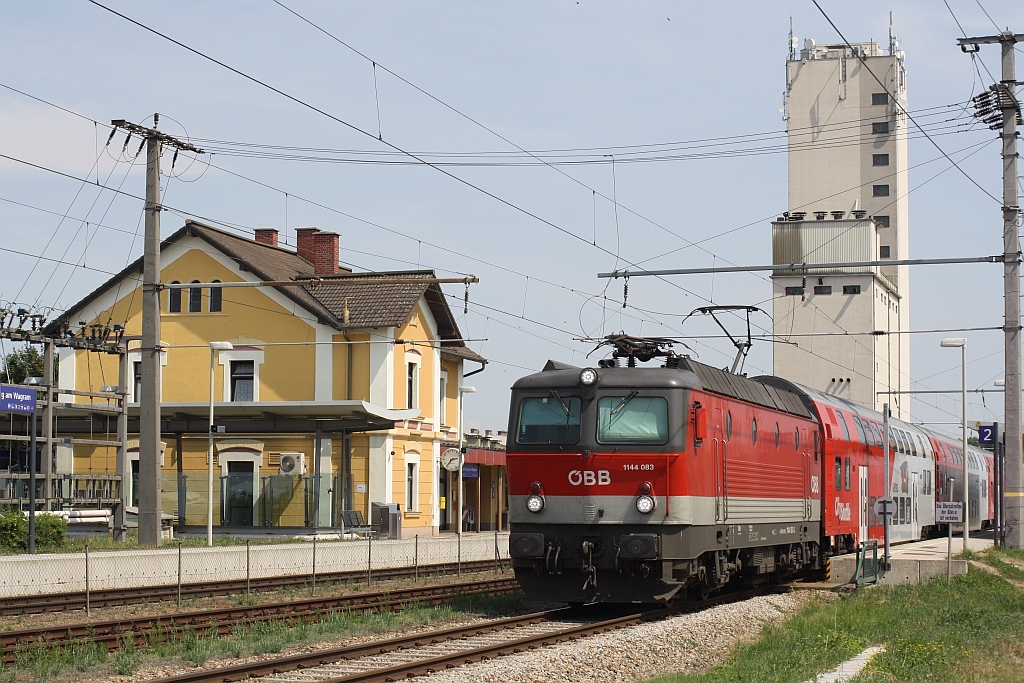 1144 083-3 am 24.Juli 2015 mit dem REX 7118 im Bf. Kirchberg am Wagram.