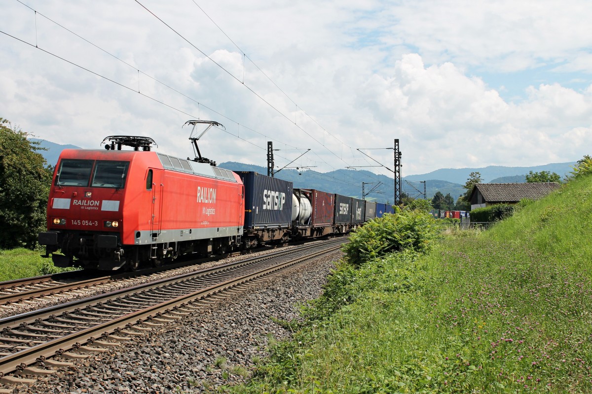 152 083-2 ist mit einen Aufliegerzug in Richtung Norden unterwegs abgelichtet am 16.07.15 im Gambach.