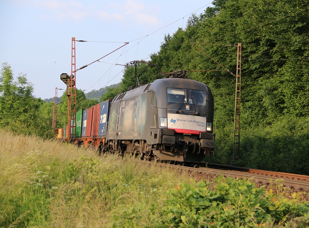 182 527 (ES 64 U2-027) mit Containerzug in Fahrtrichtung Süden. Aufgenommen zwischen Friedland(HAN) und Eichenberg am 01.06.2014.