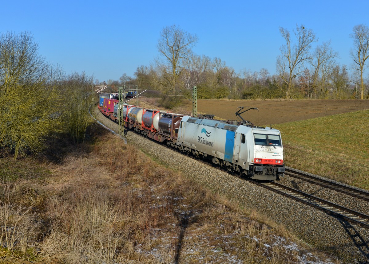 185 635 mit einem KLV am 03.03.2015 bei Langenisarhofen.