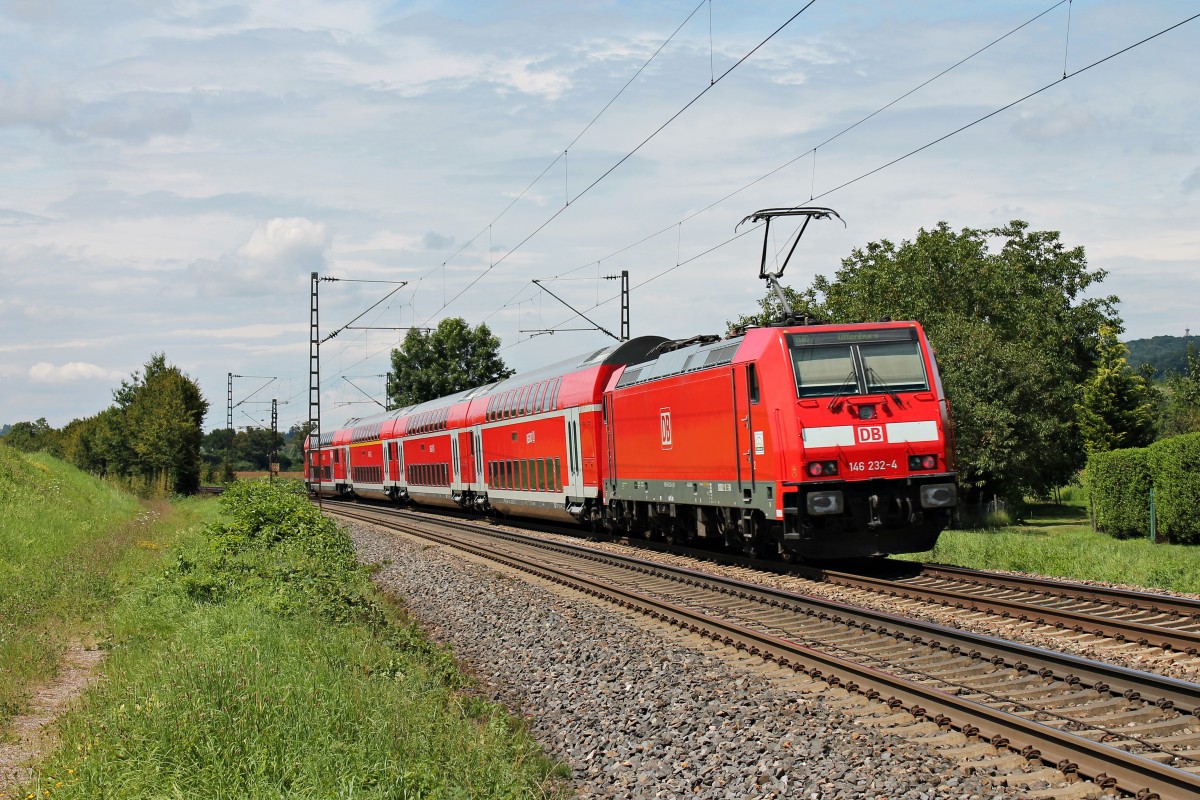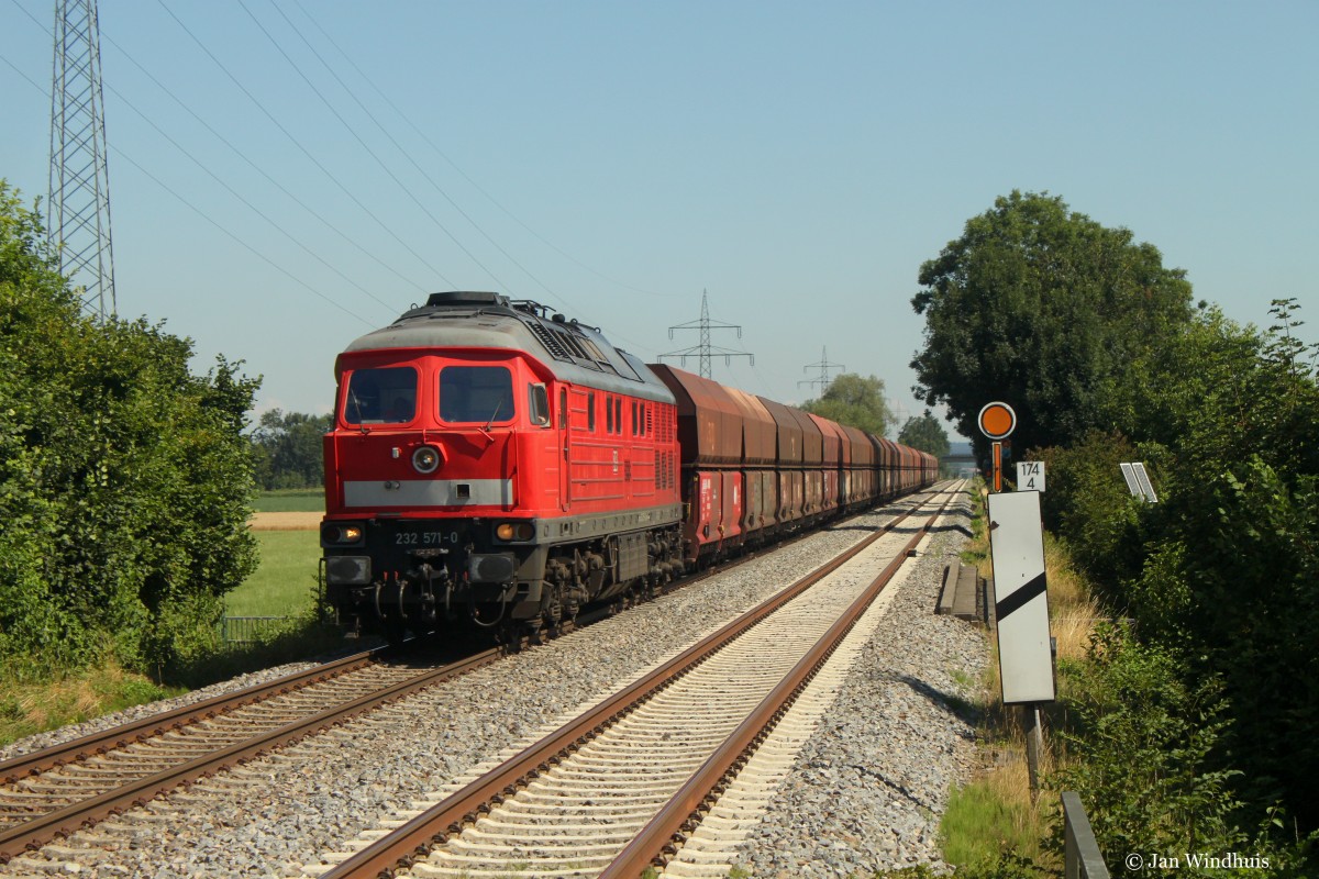 232 571-0 durchfährt am 21.07.2015 mit einem langen Ganzzug den Haltepunkt Weingarten Berg in Südrichtung.
