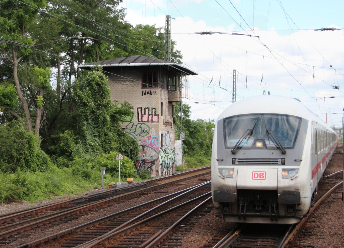 25.7.2015 Magdeburg kurz vor dem Hbf aus Richtung Norden. Altes Stellwerk + IC Steuerwagen. Aus IC aufgenommen