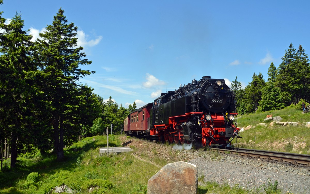 99 222 erklimmt am 30.06.15 mit ihrem Zug aus Wernigerode die letzten Meter hinauf zum Brocken.