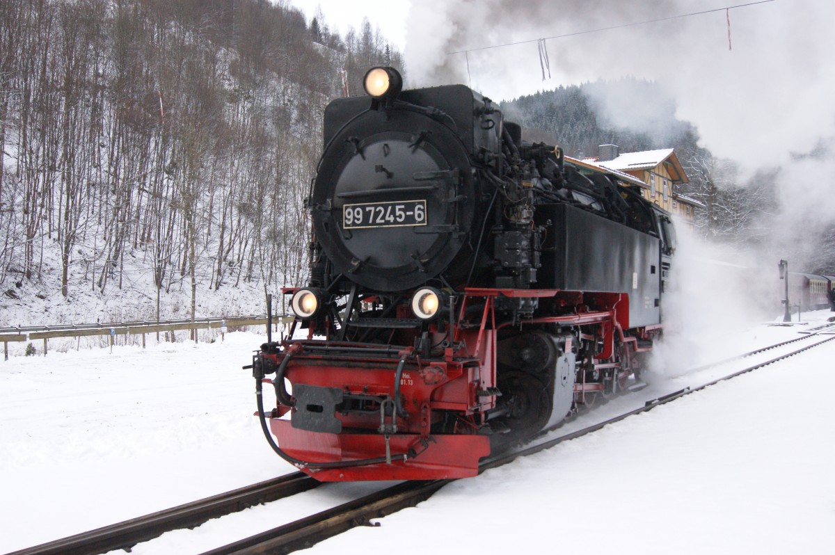99 7245 rangiert am 30.12.2014 in Eisfelder Talmühle um sich mit ihrem Personenzug auf den Rückweg nach Wernigerode zu machen.