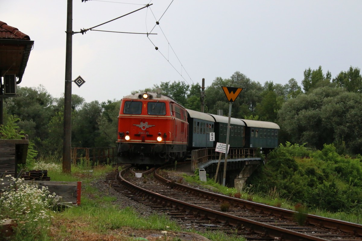 Anlässlich des 130 Jahr Jubiläums der Radkersburger Bahn die einst weiter nach Slowenien führte organisierten Freunde und Gönner der Ländlichen Eisenbahn Sonderfahrten mit 2143.35 nach Bad Radkersburg. Hier im Bild uf den letzten Metern Gleis der Bahnstrecke. 25.07.2015