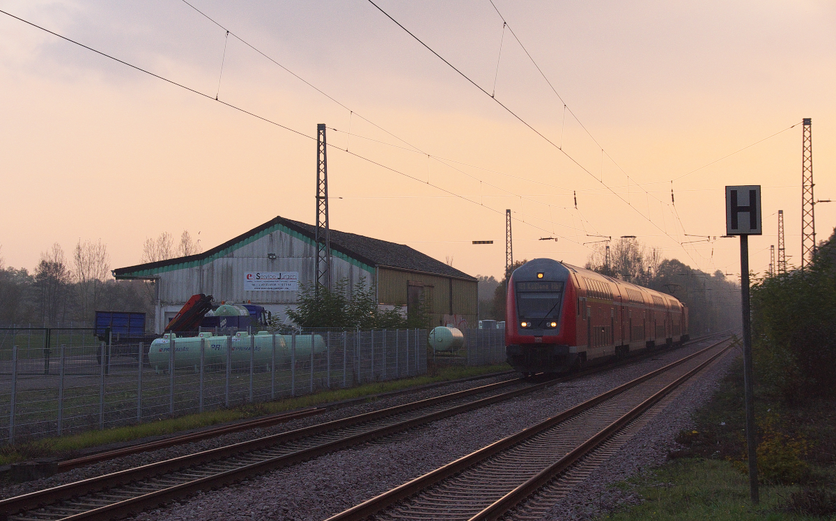 Die untergehende Abendsonne hüllte die Landschaft am Rande der Eifel in ein wundervolles Licht. 143 919 schiebt den RE 1 Saarbrücken - Koblenz gleich durch den Bahnhof Hetzerath. Die Anordnung der Fahrleitungsmasten lässt vermuten, dass die Gleisanlagen mal umfangreicher waren, besonders an der linken Seite, wo wohl ein Anschluss an ein Raiffeisengebäude bestanden hat. Bahnstrecke 3010 Koblenz - Perl Grenze am 02.11.2014