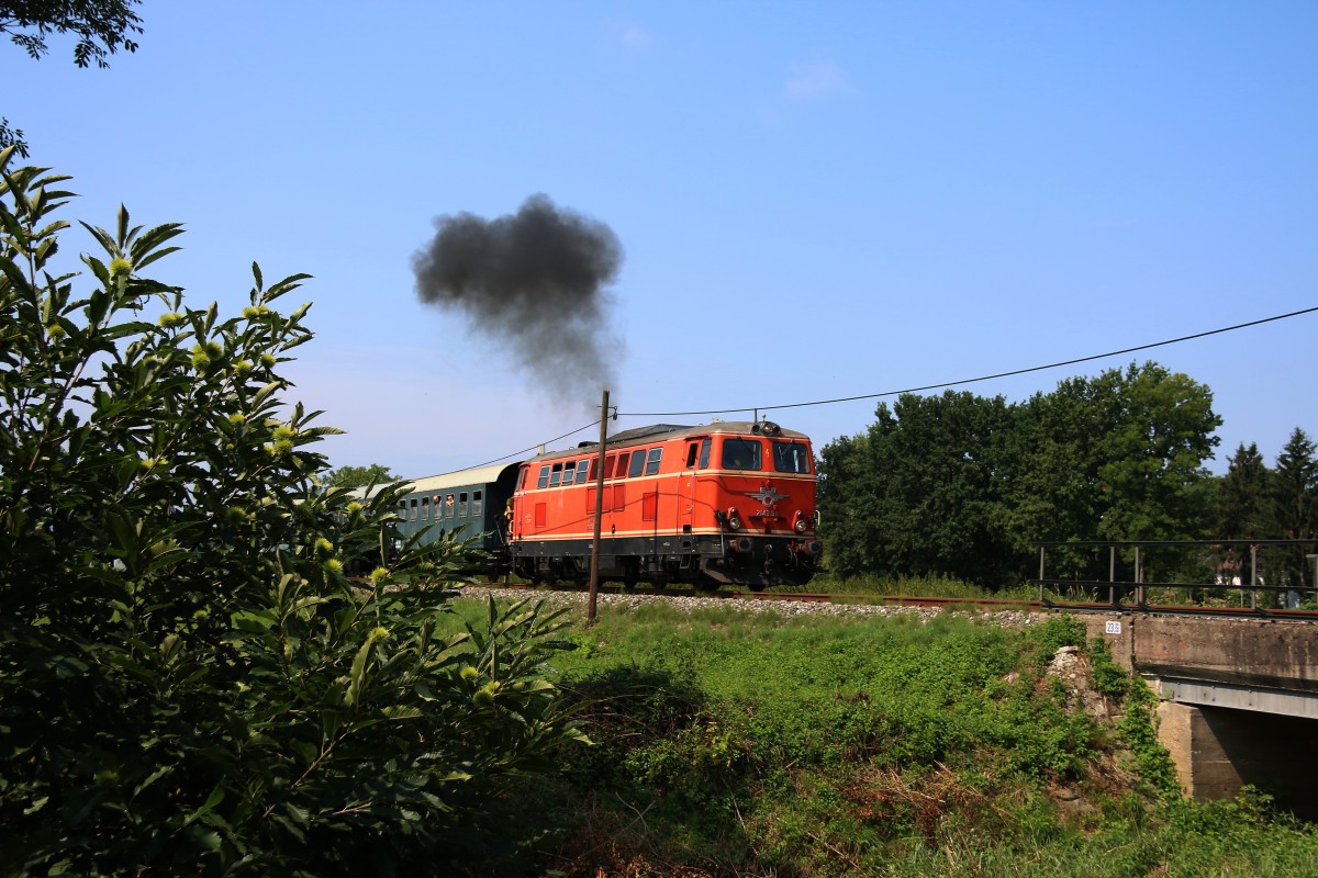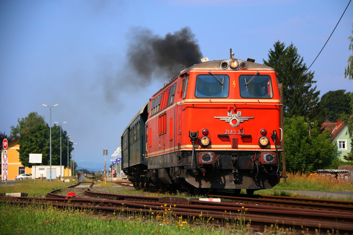 2143.35 Stand für viele Fotografen am heutigen 25.Juli 2015 im Mittelpunkt. Zusammen mit 3 Spanten Wagen der Graz Köflacher Eisenbahn bildete Sie Sonderzüge auf der Radkersburger Bahn. Bestens Organisiert von der Interessengemeinschaft " Neue Radkersburger Bahn " Qualmte die Diesellokomotive über Steirische Schienen.