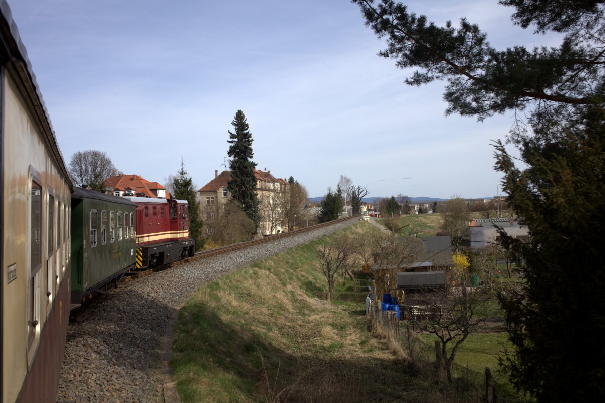 Es muß nicht immer eine Dampflok sein.....Ein Personenzug aus Johnsdorf kurz vor dem Stadtgebiet Zittau, aus dem Zug aufgenommen.12.04.2015 14:33 Uhr.