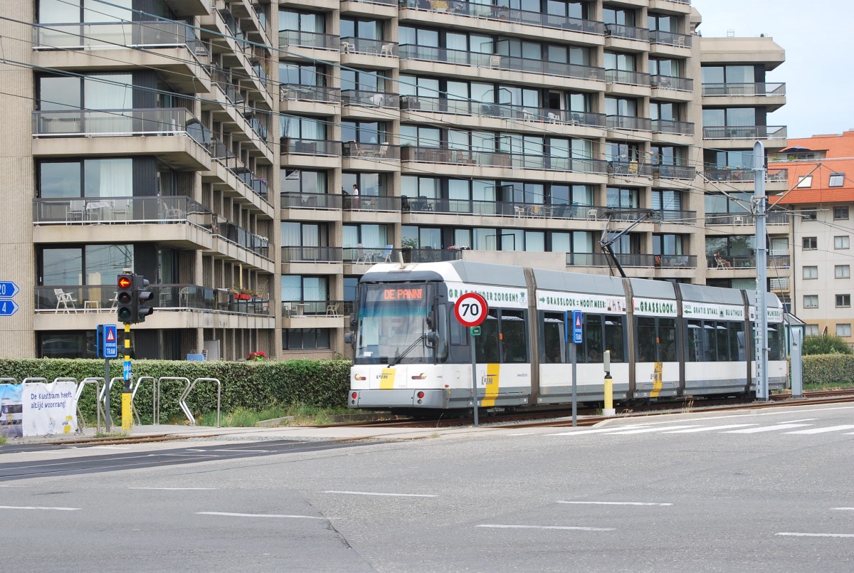 Straßenbahn von De Lijn De Panne-Knokke (HermeLijn Nr. 7269) fährt durch Nieuwpoort. 23. Juli 2015.