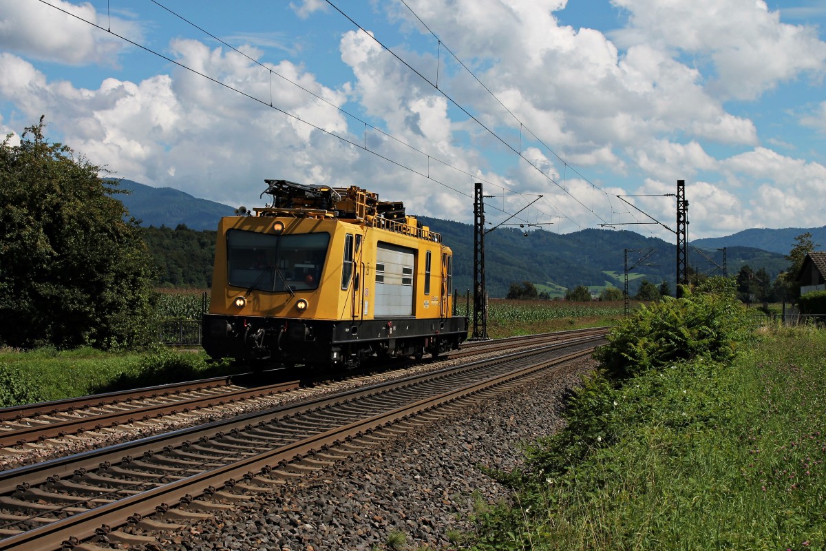 Am 08.08.2014 fuhr dieser OMF von DB Bahnbau Gruppe der Baureihe 706 bei Kollmarsreute in Richutng Norden.