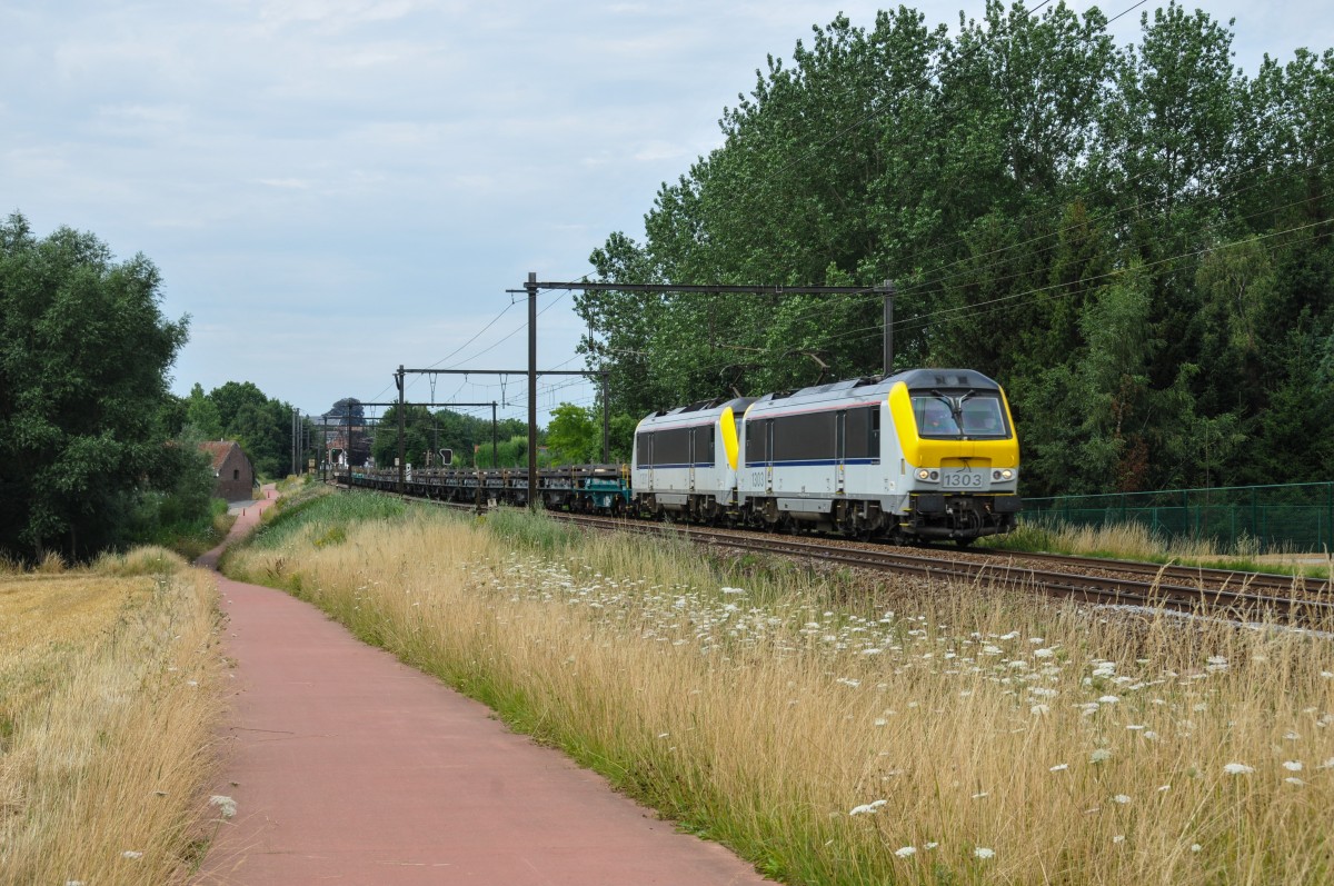 Das Doppelgespann 1303 und 1301 zieht einen Stahlzug Richtung Lüttich, aufgenommen am 24/07/2015 auf der Linie 34 bei Hoeselt.