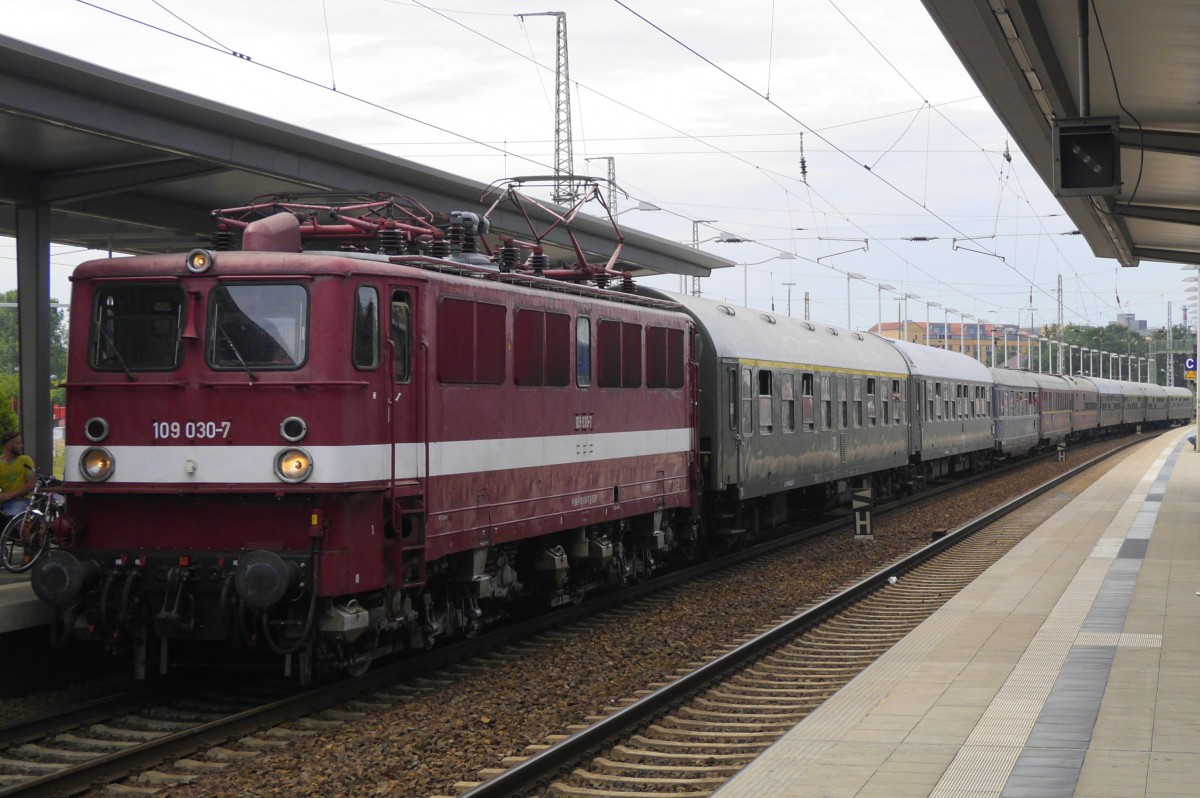 109 030-7 ist mit dem aus 7 DR-1.Klasse-Wagen und 3 Mitropa-Speisewagen bestehenden Störtebeker-Express auf dem Weg nach Rügen (Eberswalde, 25.7.15).