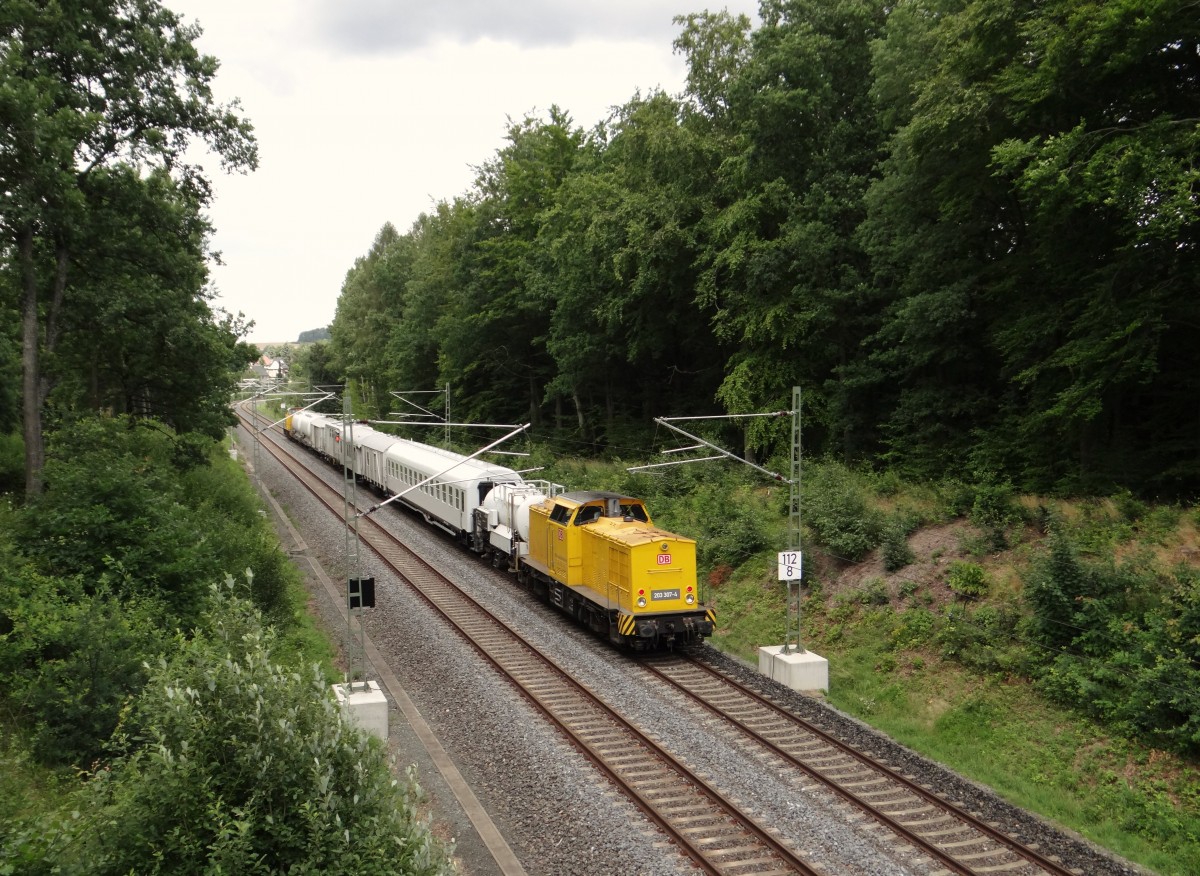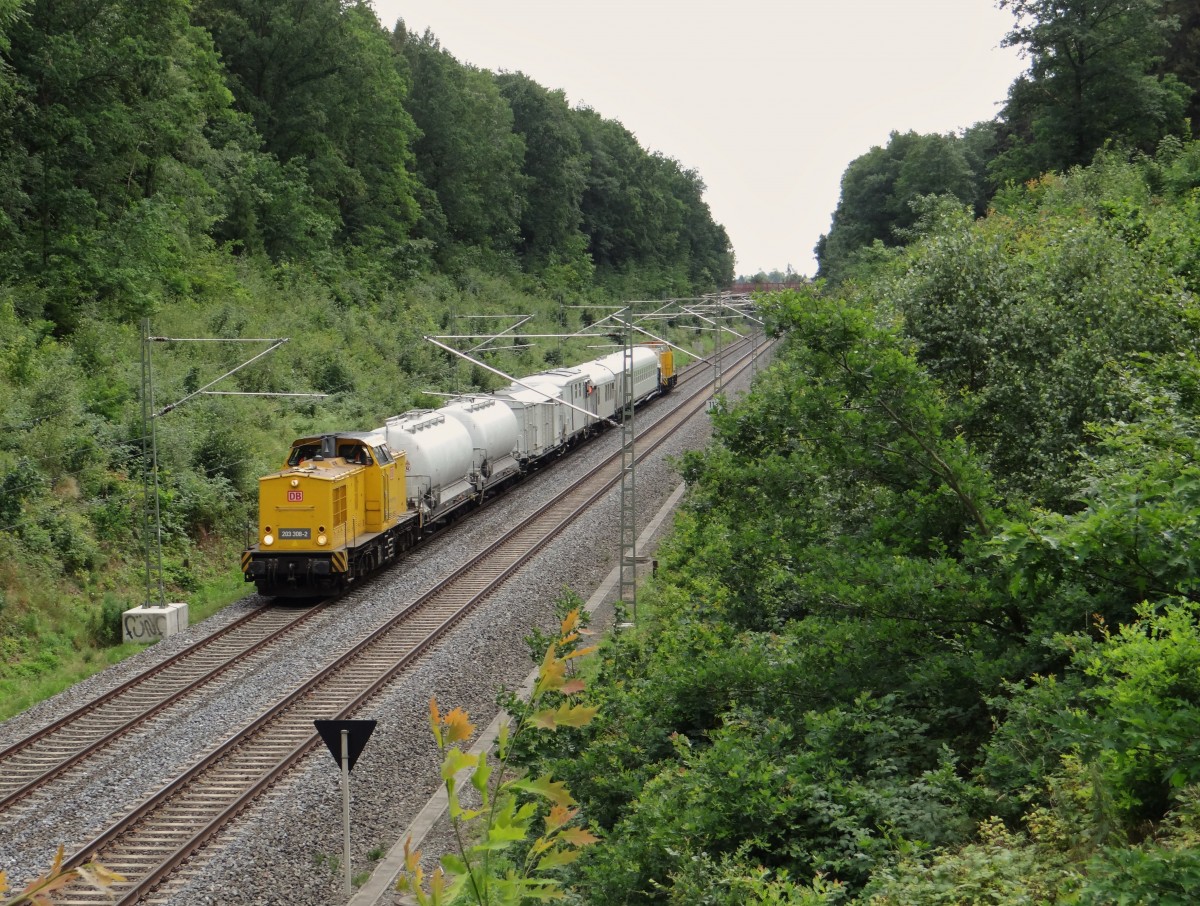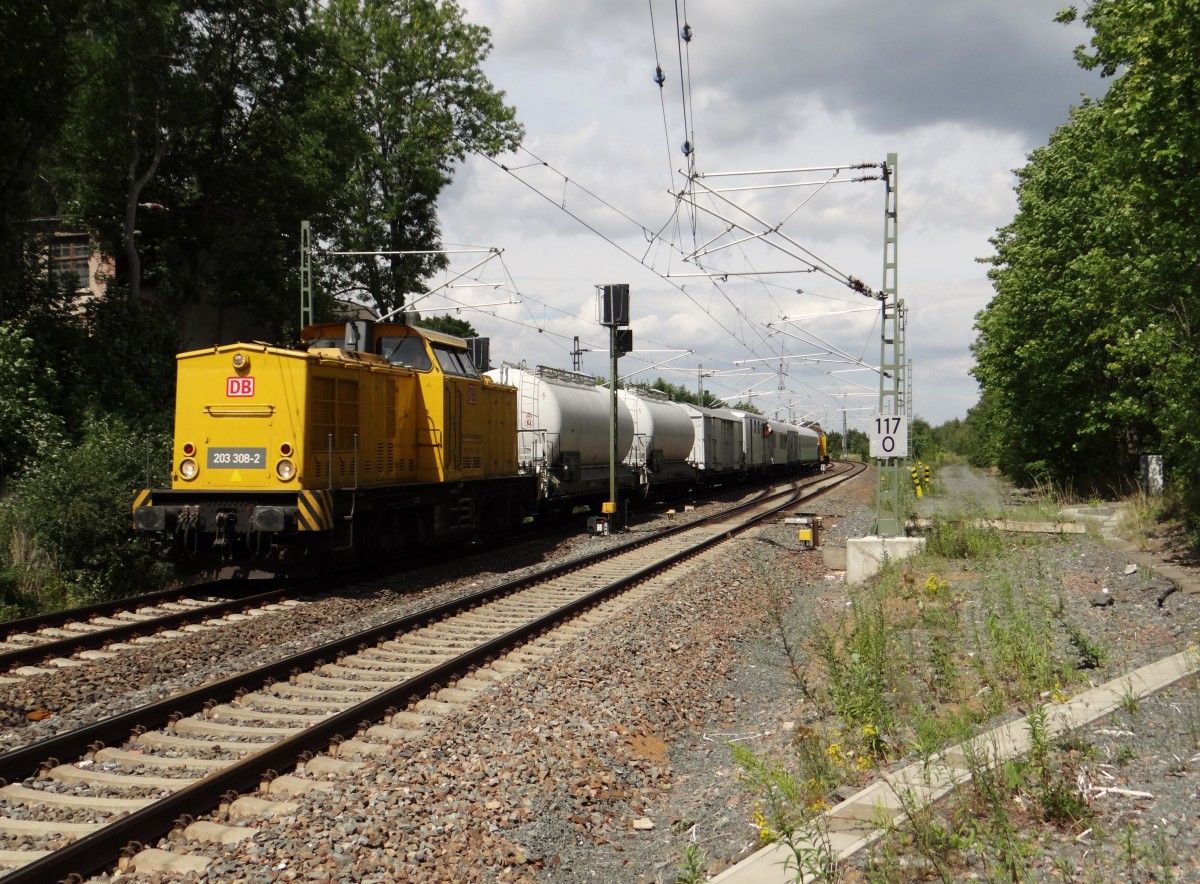 203 308-2 und 203 307-4 zu sehen am 28.07.15 mit einen Unkrautbekämpfungszug bei der Einfahrt in Plauen/V oberer Bahnhof.