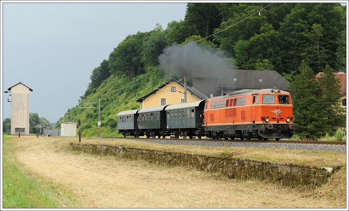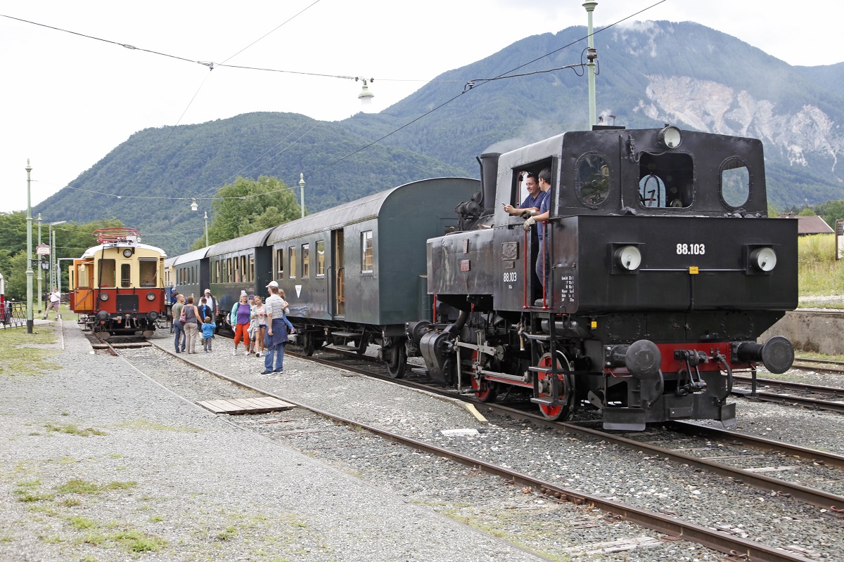 Während die letzten Fahrgäste den Zug besteigen wartet die 88.103 in Ferlach auf die bevorstehende Abfahrt. Am Nebengleis steht der ET 22 104 (ex Stern u..Hafferl) der als Zubringer vom Historama diente. Ferlach 26.07.2015.