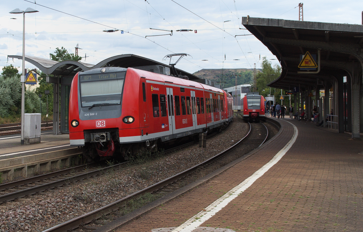 426 006 und ein 425er sind als RB Homburg - Trier in den Hauptbahnhof von Saarlouis eingefahren. Im Hintergrund verlässt gerade der Gegenzug (426 021) nach Homburg den Hbf. in Saarlouis. Bahnstrecke 3230 Saarbrücken - Karthaus 27.07.2015