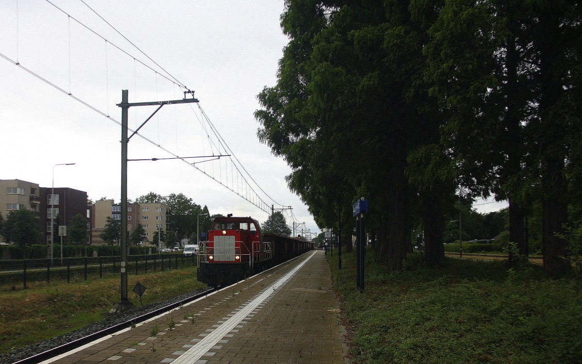 6511 von DB Schenker kommt mit einem langen Schrottleerzug aus Genk-Goederen(B) nach Köln-Gremberg(D) und fährt durch Geleen-Lutterade und fährt in Richtung Sittard(NL). Aufgenommen in Geleen-Lutterade(NL).