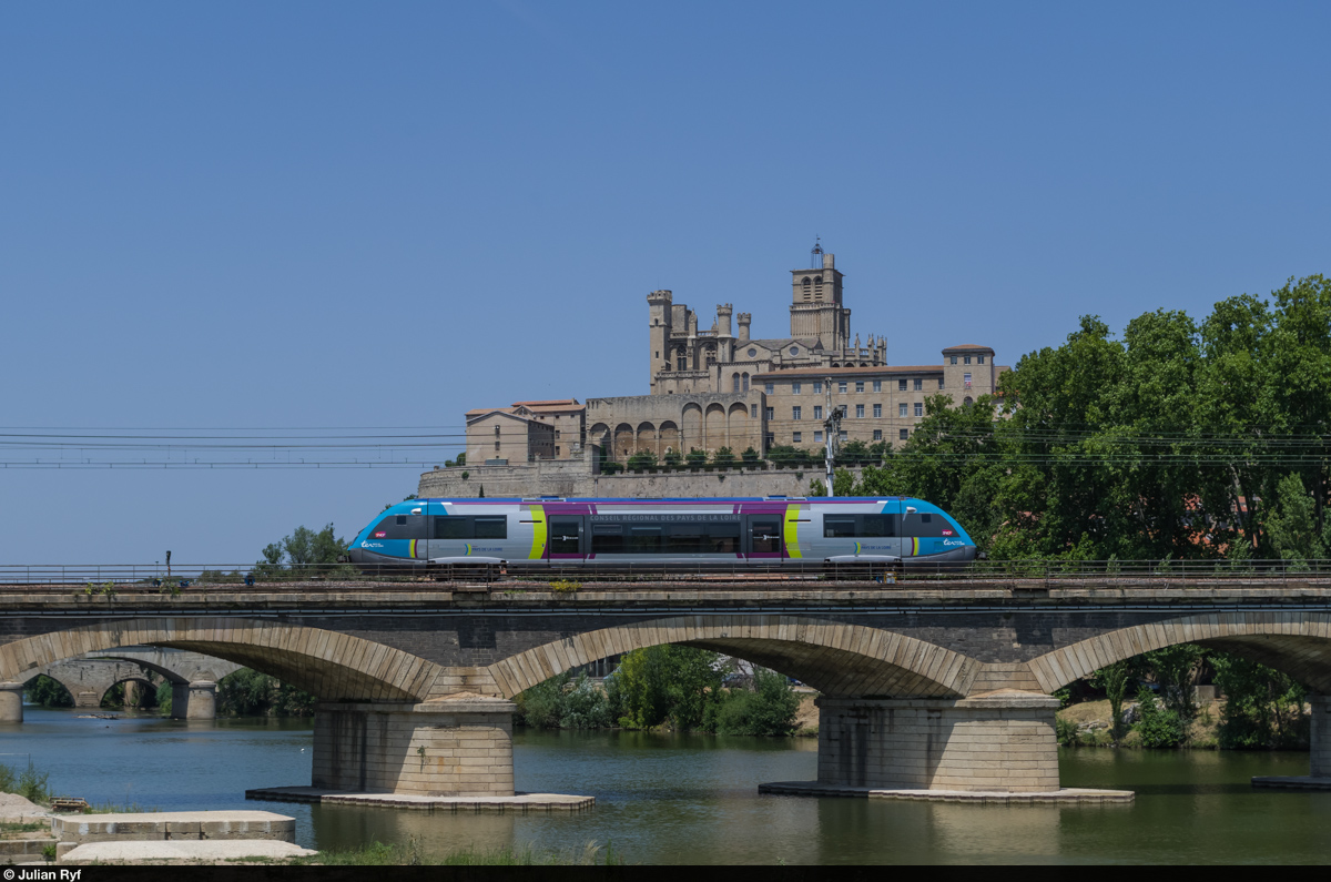 Am 11. Juli 2015 verirrte sich ein X 73500 "Baleine" aus dem Pays de la Loire nach Béziers, wahrscheinlich auf einer Überführungsfahrt. Hier überquert er gerade den Orb mit der Kathedrale Saint Nazaire de Béziers im Hintergrund.