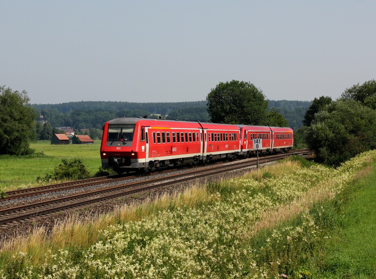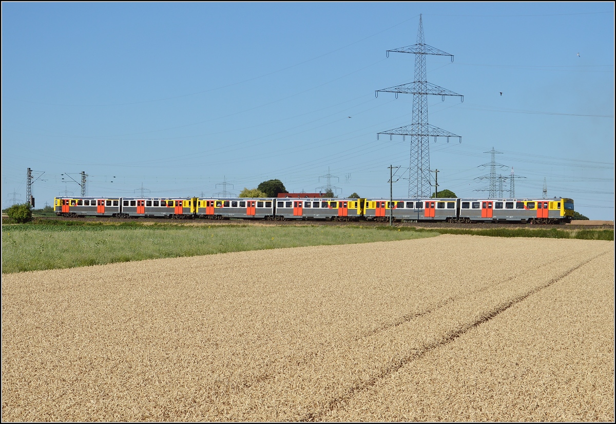 VT2E der Hessischen Landesbahn in Dreifachtraktion im freien Feld. Eschborn, Juli 2015.