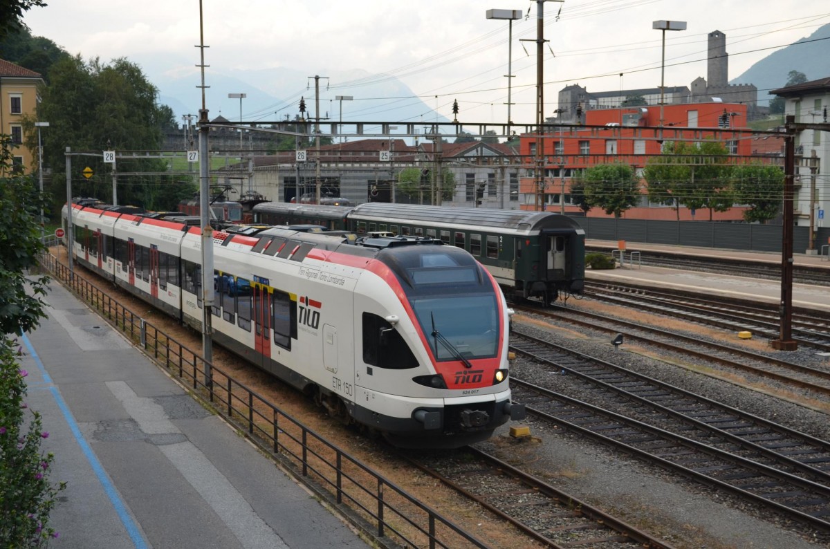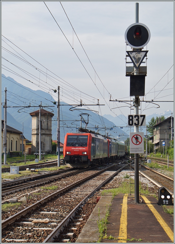 Die beiden SBB Re 474 017 und 003 erreichen mit einer RoLa von Novara kommend den Bahnhof Domodossola.