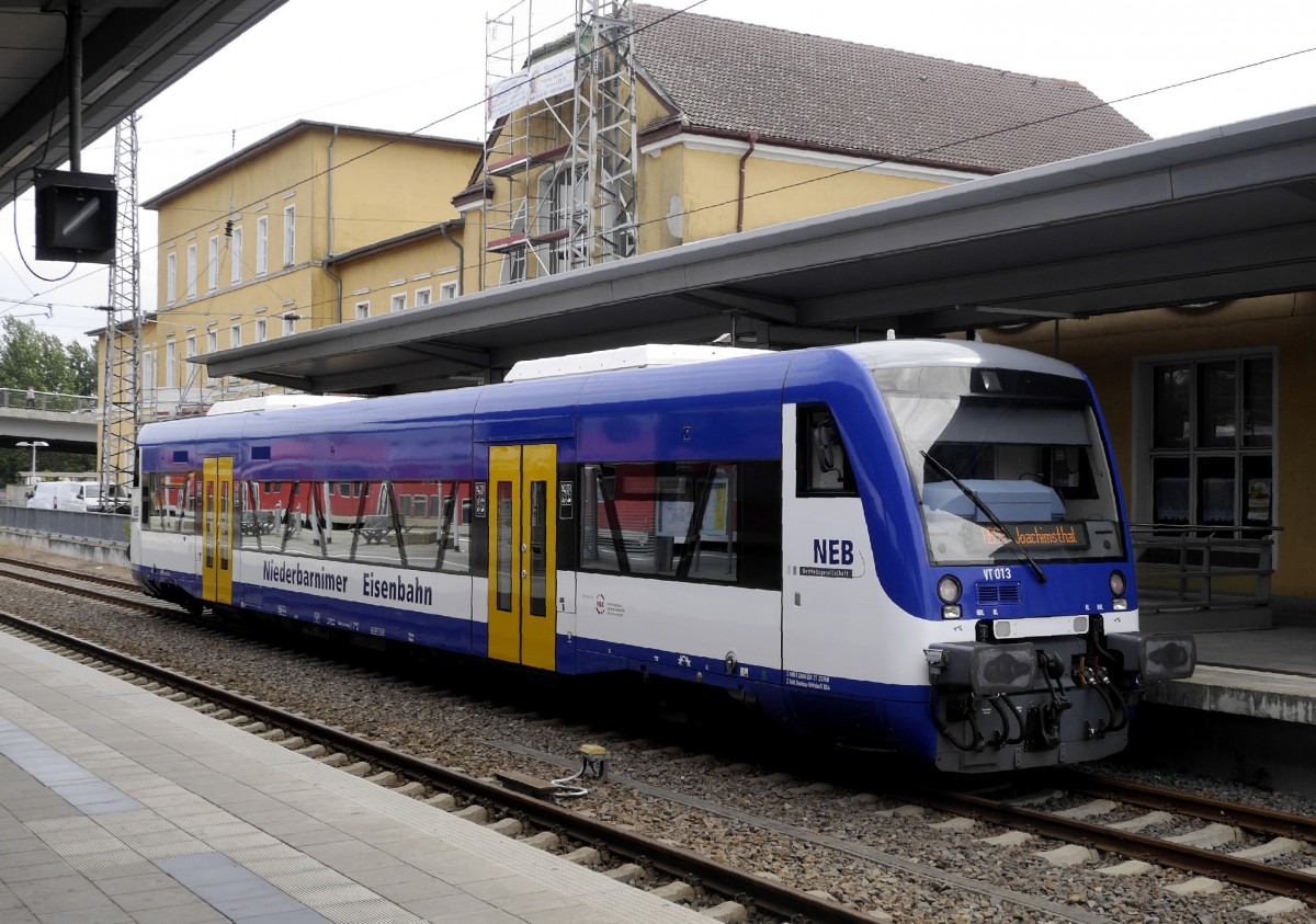 Die von Eberswalde ausgehenden Regionalbahn-Linien nach Joachimsthal und Frankfurt (O) werden von der Niederbarnimer Eisenbahn mit RS 1 bedient. Im Bild: VT 013 (650 545, ex Mitteldeutsche Regionalbahn/VVRO) abfahrbereit nach Joachimsthal (25.7.15).