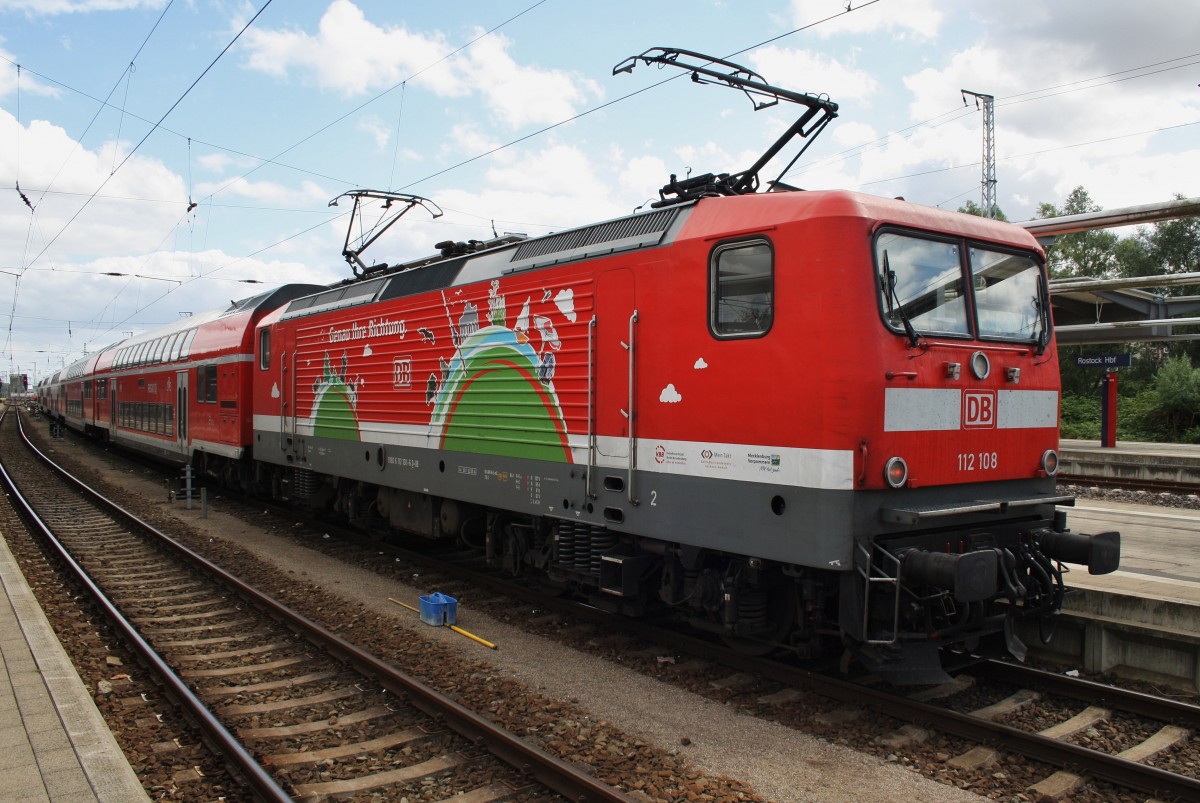 Hier 112 108 mit einem RE5 (RE4365) von Rostock Hbf. nach Lutherstadt Wittenberg, dieser Zug stand am 26.7.2015 in Rostock Hbf.