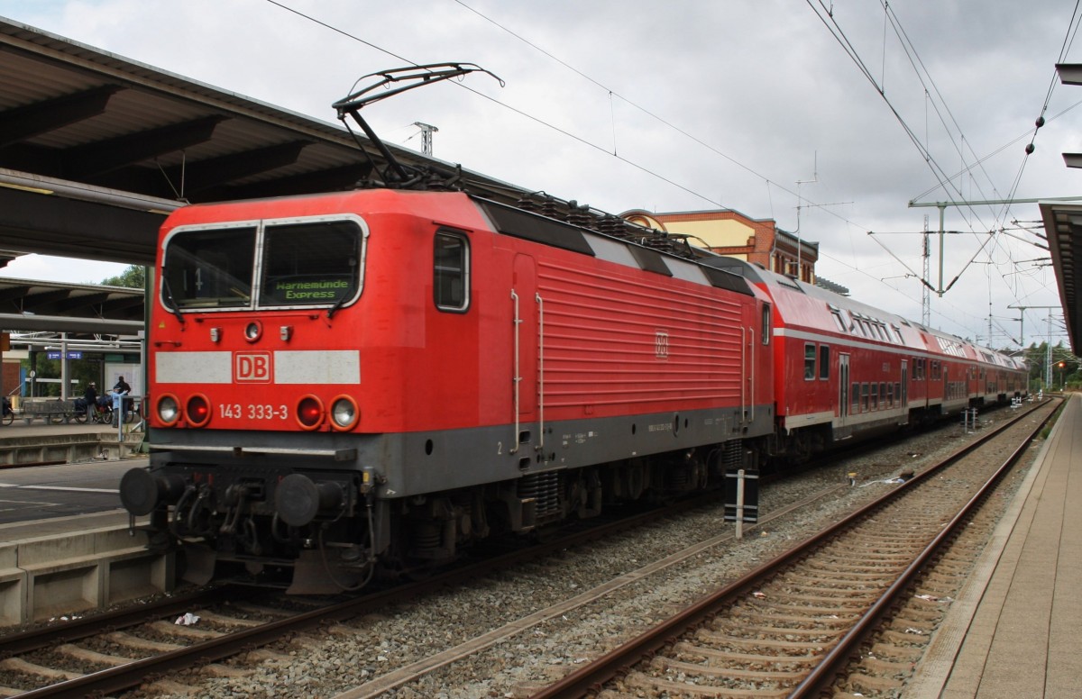 Hier 143 333-3 mit einem RE5 (RE18590) "Warnemünde-Express" von Berlin Hbf. (tief) nach Warnemünde, bei der Ausfahrt am 26.7.2015 aus Rostock Hbf.