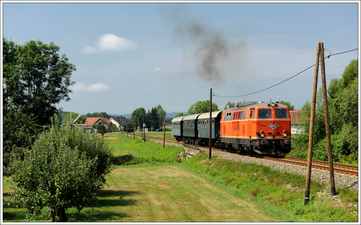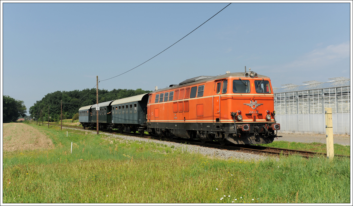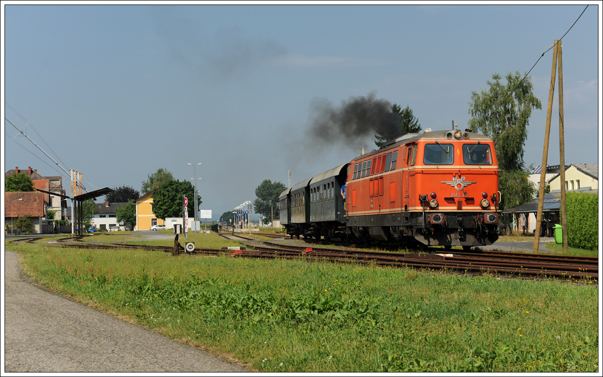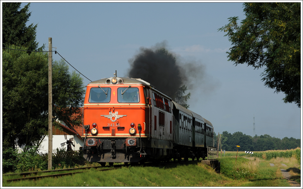 2143.35 bei der Rückfahrt von Bad Radkersburg nach Graz, bereits wieder auf der Südbahn als Sdz SR 17023 unterwegs, am 25.7.2015 kurz vor Ehrenhausen aufgenommen.