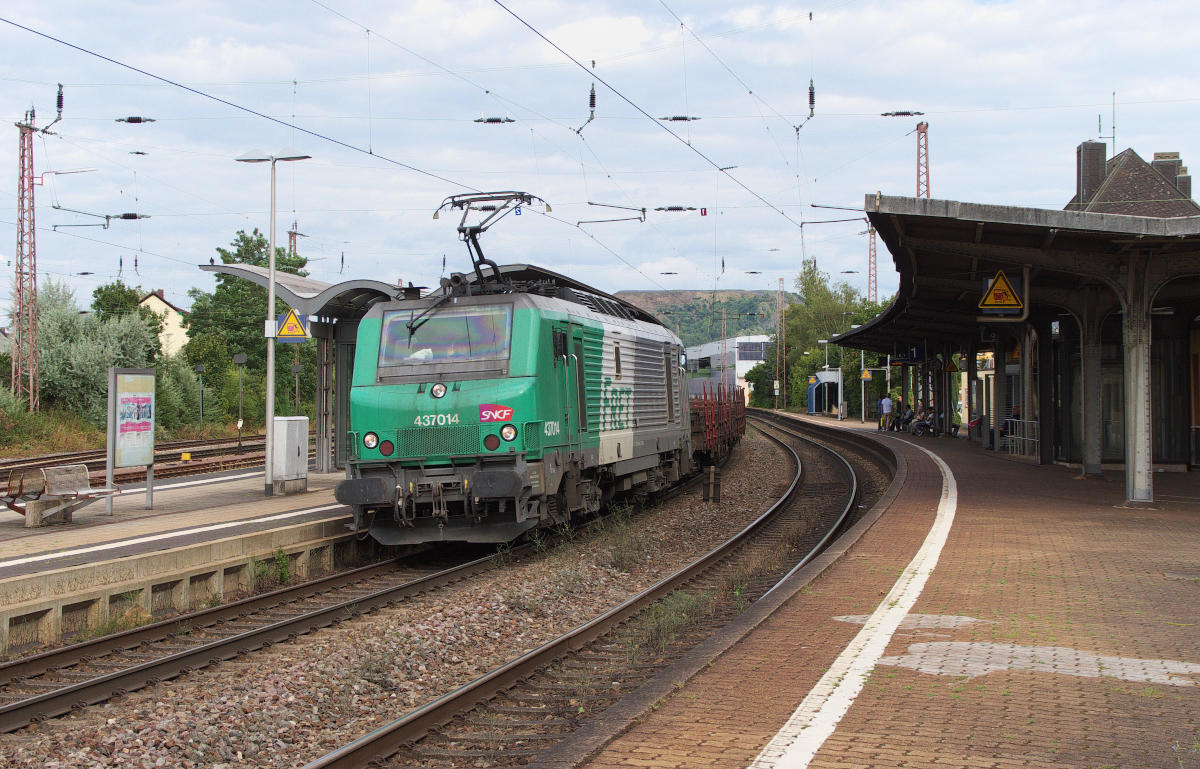 SNCF 4 37014 bringt leere Wagen aus Dünkirchen zur Dillinger Hütte. Täglich pendelt der Brammenzug zwischen Dillingen Hütte und Dünkirchen. Bahnstrecke 3230 Saarbrücken - Karthaus in Saarlouis Hbf. am 27.07.2015