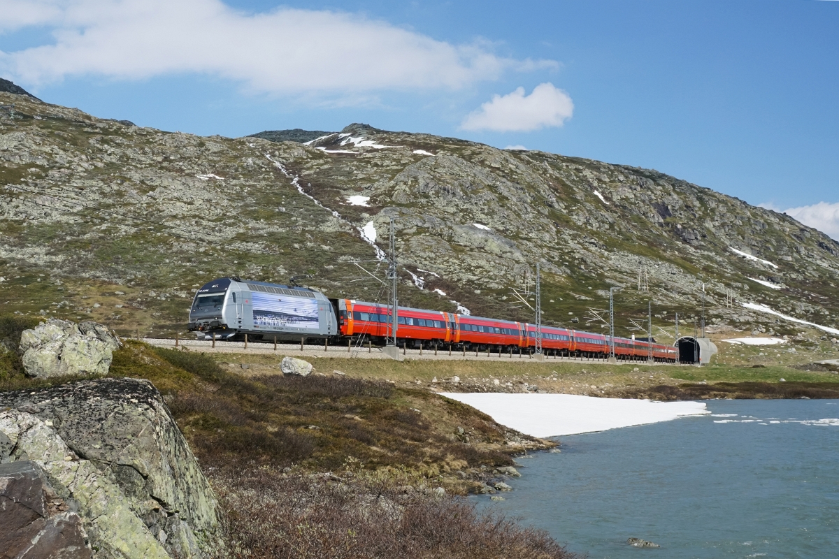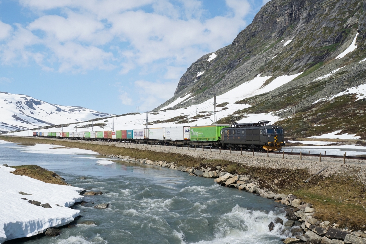 Sommerferien in Skandinavien, 1. Teil: An der Bergenbahn: Am 03.07.2015 kommt die El 18 2246 mit dem Rt 601 aus dem Gråskallen-Tunnel bei Tunga geschossen und strebt Finse entgegen. Die Landschaft hier oben präsentiert sich ähnlich wie die hochalpine Landschaft in der Schweiz (z.B. Berninabahn). Sogar die Loks wurden in der Schweiz entwickelt. Der grosse Unterschied liegt in der Geschwindigkeit, mit welcher die Züge angefahren kommen. Während die Berninabahn in gemütlichem Tempo über den Pass rollt, brausen hier die Züge mit bis zu 160 km/h durch das Gebirge.