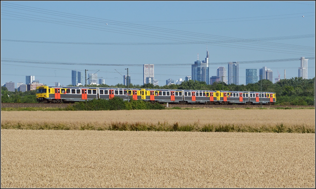 VT2E der Hessischen Landesbahn in Dreifachtraktion vor der Frankfurter Skyline. Eschborn, Juli 2015.