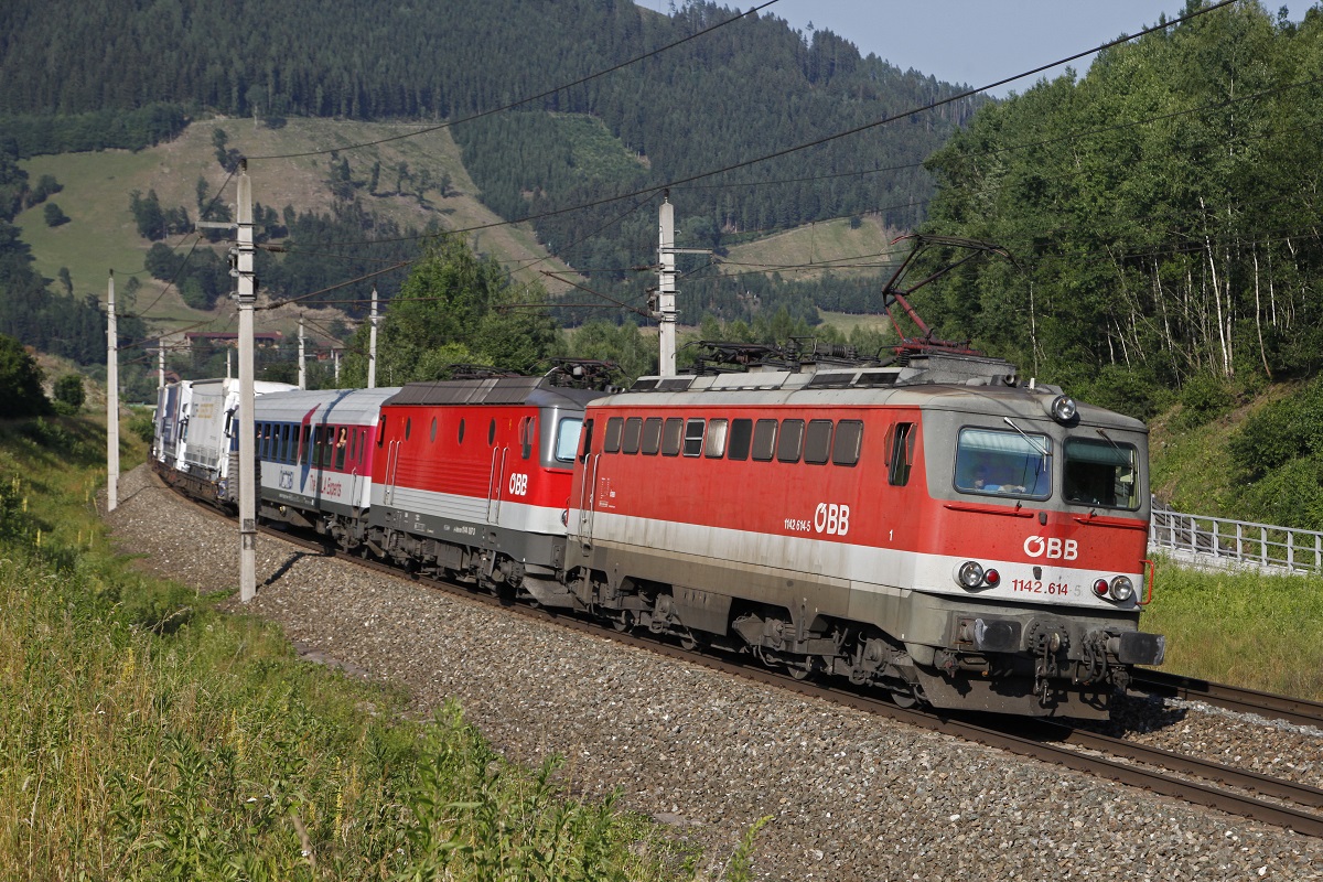 1142.614 + 1144.097 mit Güterzug bei Oberaich am 4.07.2015.