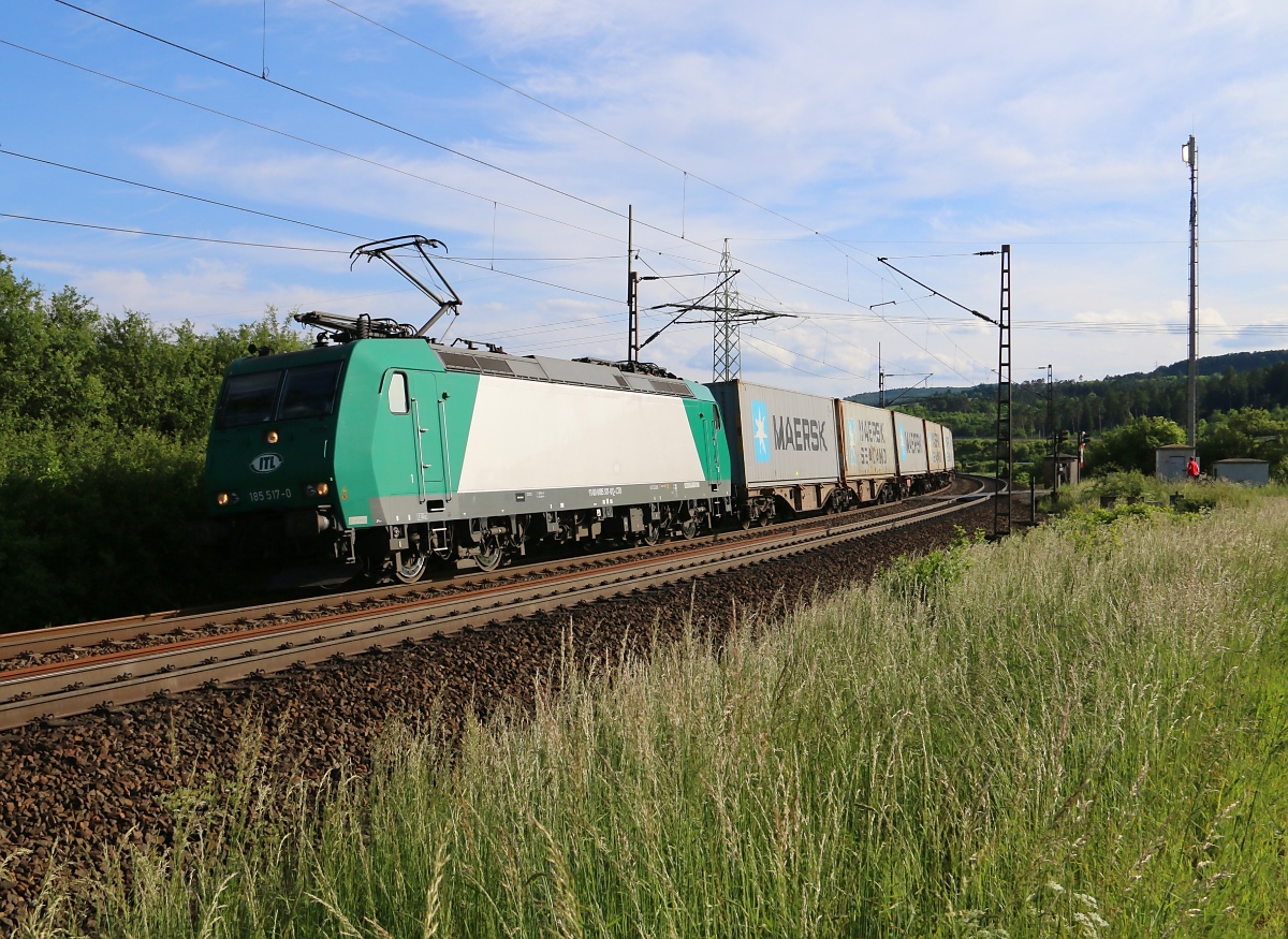 185 517-0 der ITL mit Containerzug in Fahrtrichtung Norden. Aufgenommen zwischen Eichenberg und Friedland(HAN) am 25.05.2014