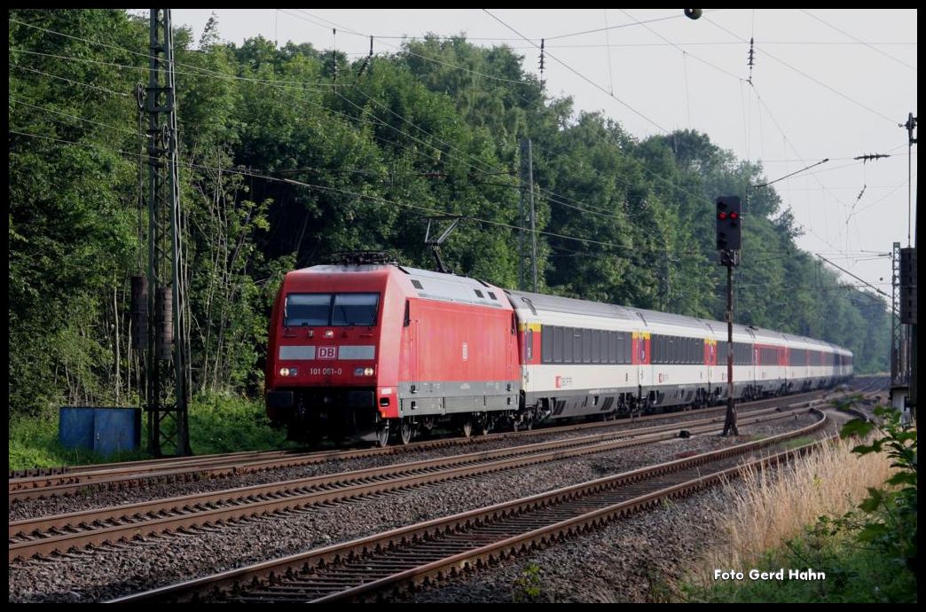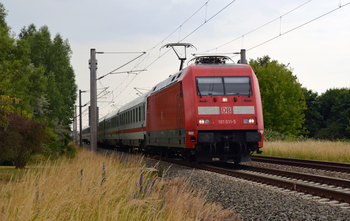 Noch bis zum 31. Juli wird der Fernverkehr der Strecke der Strecke Halle-Magdeburg wegen Bauarbeiten über Dessau umgeleitet. Am 21.06.15 zieht 101 011 den IC 2039 mit Ziel Leipzig durch Greppin Richtung Bitterfeld.