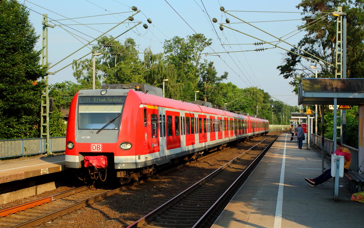Am frühen Abend des 03.07.2015 fährt 423 196 in Neuss Süd ein, anscheinend wurde die vor dem Triebwagen sichtbare linke Schiene erst vor kurzem eingefügt
