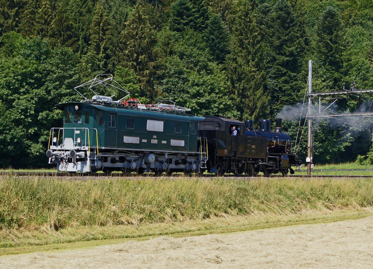 Das allererste elektrische Triebfahrzeug der Wengernalpbahn (1908), Lok 51, ist noch gesund und munter, hier für Fahrleitungsarbeiten in Grindelwald Grund, 27.April 2015.
