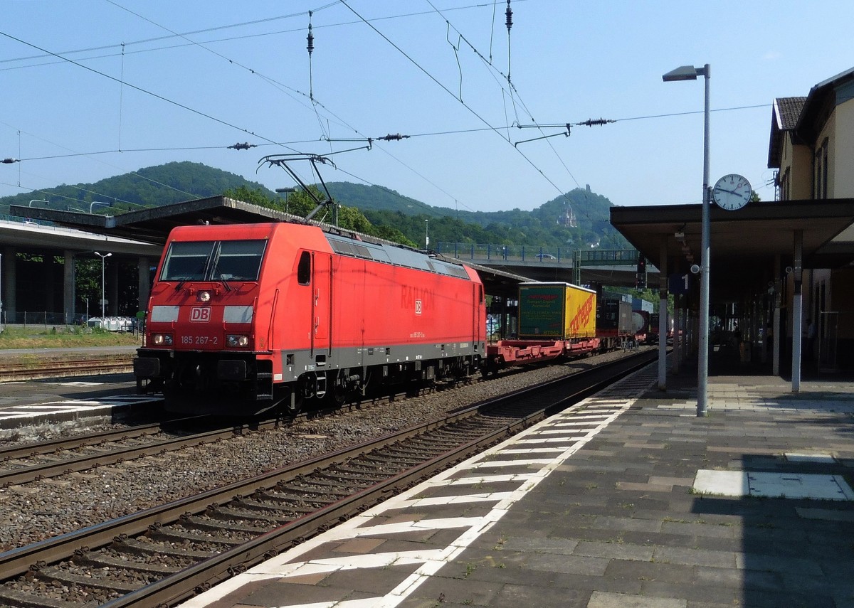 Die 185 267-2 mit einem Güterzug in Richtung Köln bei der Durchfahrt des Königswinter Bahnhof , Den 03.07.2015